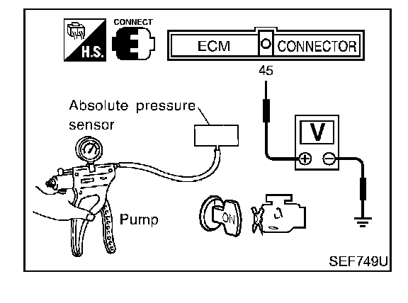 3. Turn ignition switch "ON" and check output voltage between ECM terminal 45 and engine ground. The voltage should be 3.2 to 4.8 V.