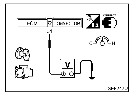 3. Check voltage between ECM terminal 54 (Mass air flow sensor signal) and ground.