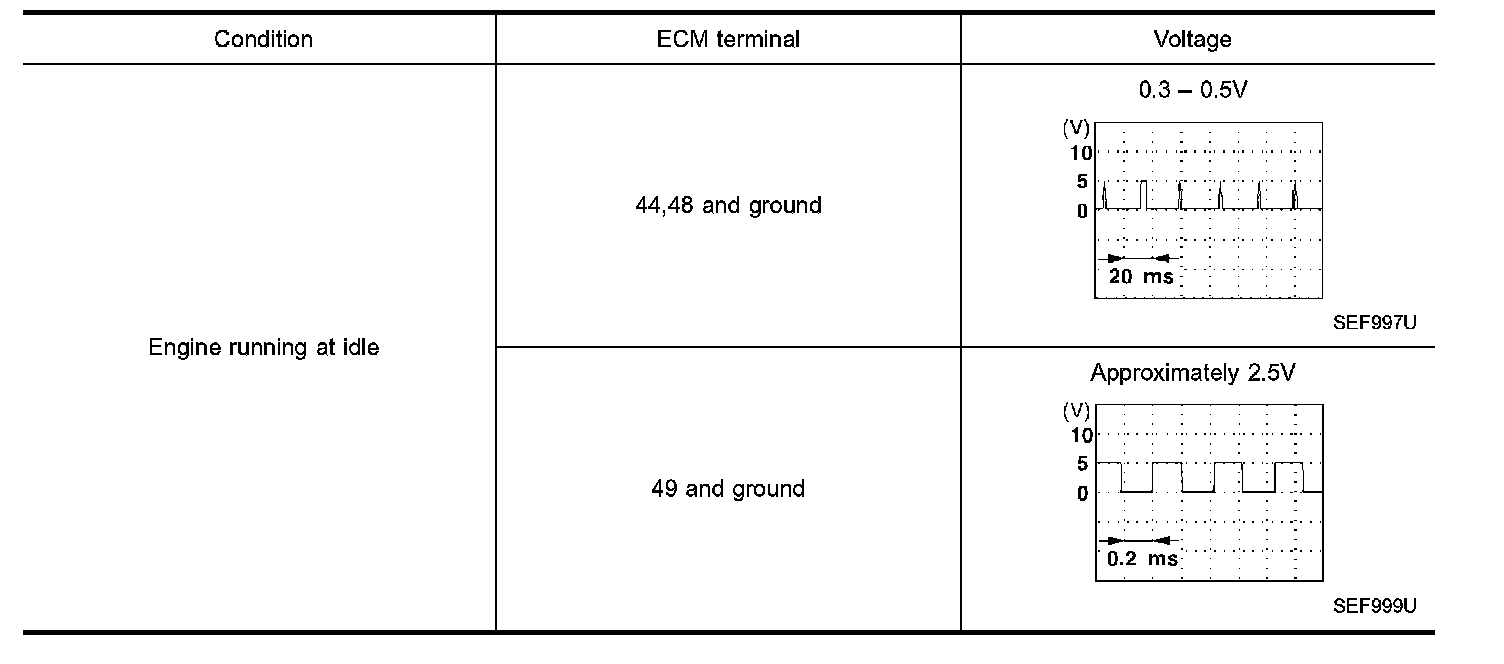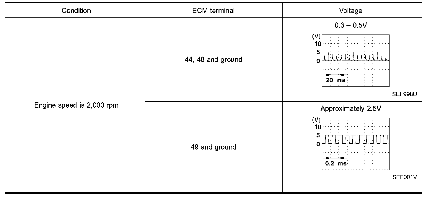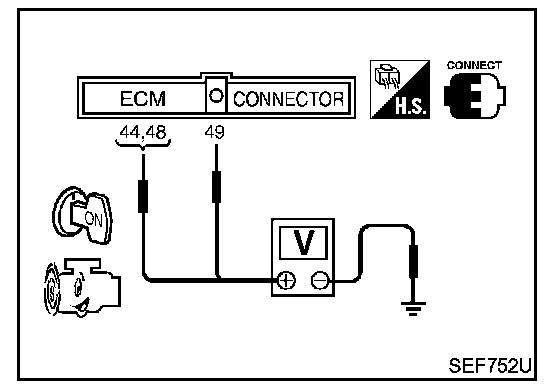 3. Check voltage between ECM terminals 44, 48 and ground, ECM terminal 49 and ground with DC range.