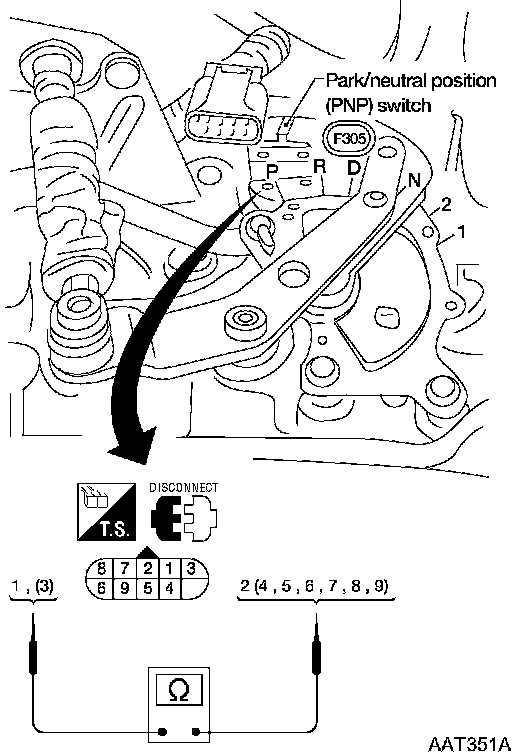 4. If NG on step 2, remove park/neutral position (PNP) switch from A/T and check continuity of park/neutral position (PNP) switch terminals. Refer to step 1.