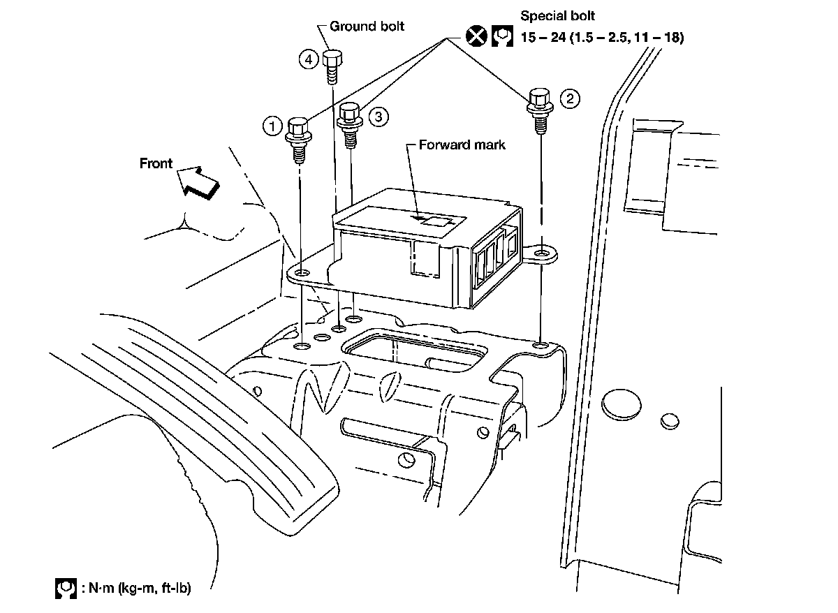 4. Remove ground bolt and also remove special bolts from air bag diagnosis sensor unit.