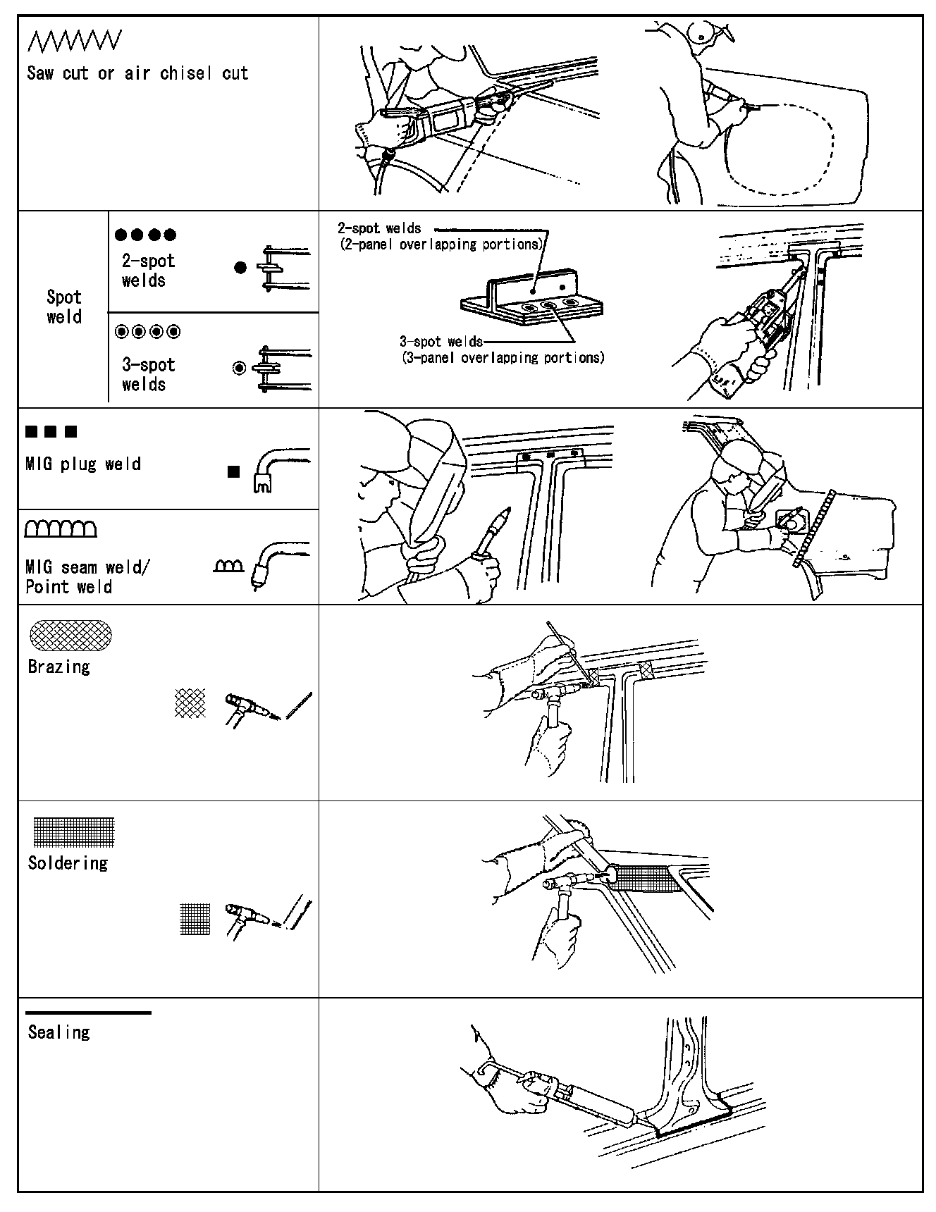 The underside of the floor and wheelhouse are undercoated to prevent rust, vibration, noise and stone chipping. Therefore, when such a panel is replaced or repaired, apply undercoating to that part. Use an undercoating which is rust preventive, soundproof, vibration-proof, shock-resistant, adhesive, and durable.
