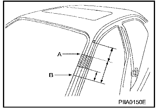 Front pillar butt joint can be determined anywhere within shaded area as shown in the figure. The best location for the butt joint is at position A due to the construction of the vehicle. Refer to the front pillar.