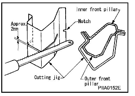 Determine cutting position and record distance from the locating indent. Use this distance when cutting the service part. Cut outer front pillar over 60 mm above inner front pillar cut position.