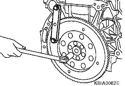 7. Remove the flywheel (M/T models) or drive plate (A/T models). Hold the crankshaft with a stopper plate and remove the mounting bolts.