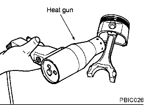 ^ Using a heat gun, heat the piston [approximately 60° - 70°C (140° - 158°F)] until the piston pin can be pushed in by hand without excessive force. From the front to the rear, insert the piston pin into the piston and the connecting rod.