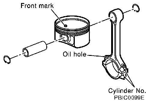 ^ Assemble so that the front mark on the piston crown and the oil holes and the cylinder No. on the connecting rod are positioned as shown in the figure.