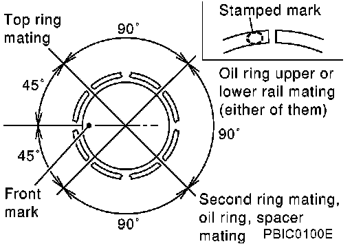 ^ Position each ring with the gap as shown in the figure, referencing the piston front mark as the starting point.