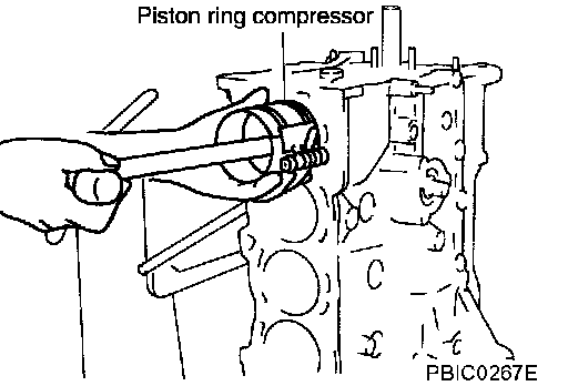 ^ Using a piston ring compressor, install the piston with the front mark on the piston crown facing the front of the engine.