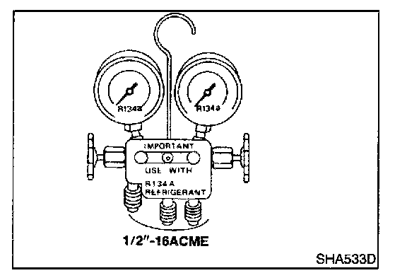 Be certain that the gauge face indicates R-134a or 134a. Be sure the gauge set has 1/2"-16 ACME threaded connections for service hoses. Confirm the set has been used only with refrigerant HFC-134a (R-134a) and specified lubricants.