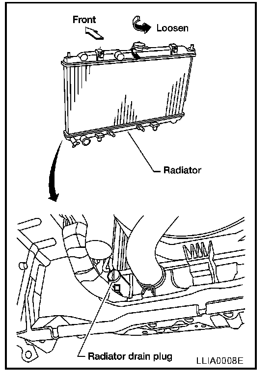 2. Open radiator drain plug at the bottom of the radiator, and remove radiator filler cap.