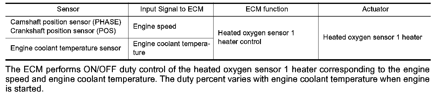 The heated oxygen sensor 1 is placed into the exhaust manifold. It detects the amount of oxygen in the exhaust gas compared to the outside air. The heated oxygen sensor 1 has a closed-end tube made of ceramic zirconia. The zirconia generates voltage from approximately 1V in richer conditions to 0V in leaner conditions. The heated oxygen sensor 1 signal is sent to the ECM. The ECM adjusts the injection pulse duration to achieve the ideal air-fuel ratio. The ideal air-fuel ratio occurs near the radical change from 1V to 0V.