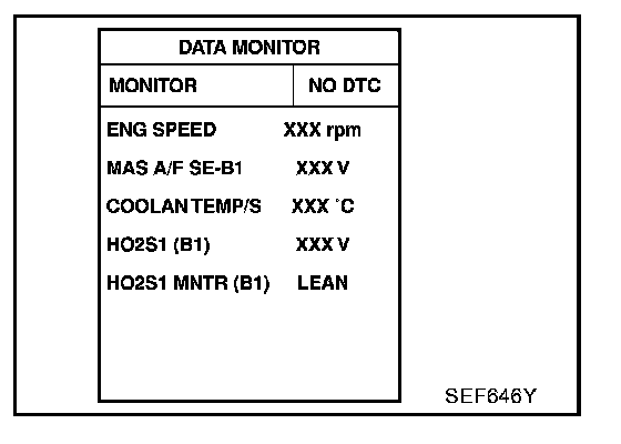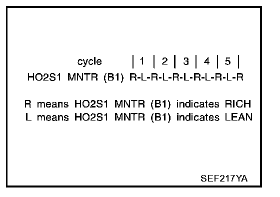 - "HO2S1 MNTR (B1)" in "DATA MONITOR" mode changes from "RICH" to "LEAN" to "RICH" 5 times in 10 seconds.