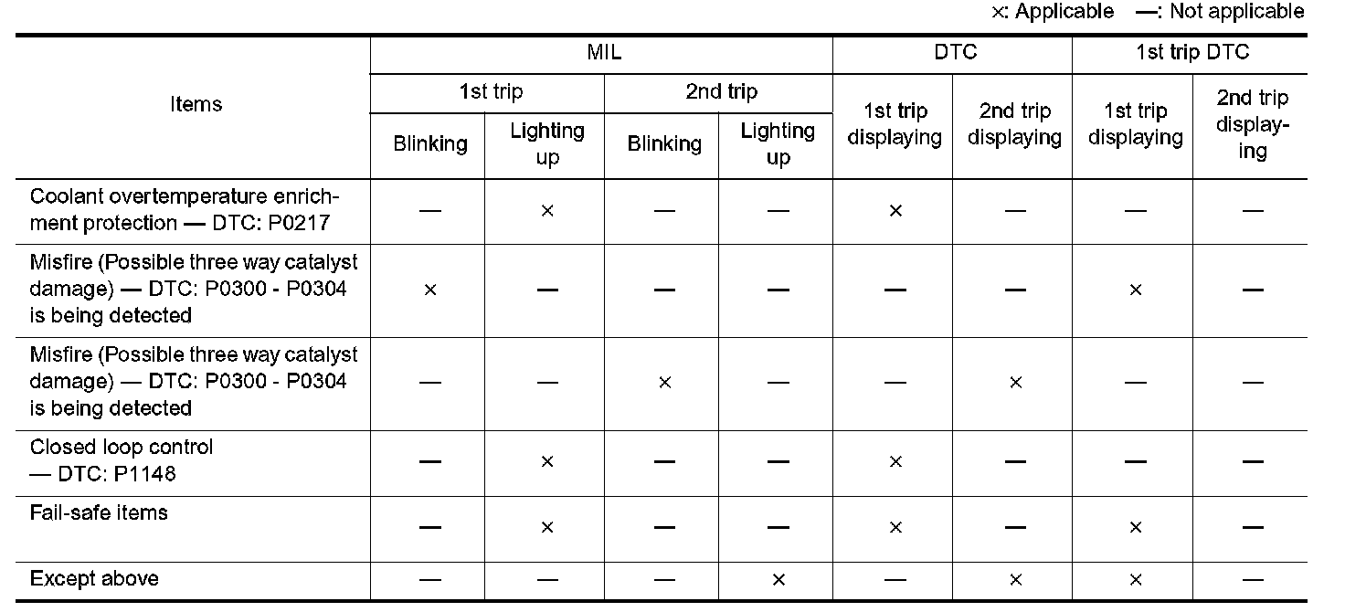If the same malfunction is detected again during the next drive, the DTC and Freeze Frame data are stored in the ECM memory, and the MIL lights up. The MIL lights up at the same time when the DTC is stored. <2nd trip> The "trip" in the "Two Trip Detection Logic" means a driving mode in which self-diagnosis is performed during vehicle operation. Specific on board diagnostic items will cause the ECM to light up or blink the MIL, and store DTC and Freeze Frame data, even in the 1st trip, as shown.