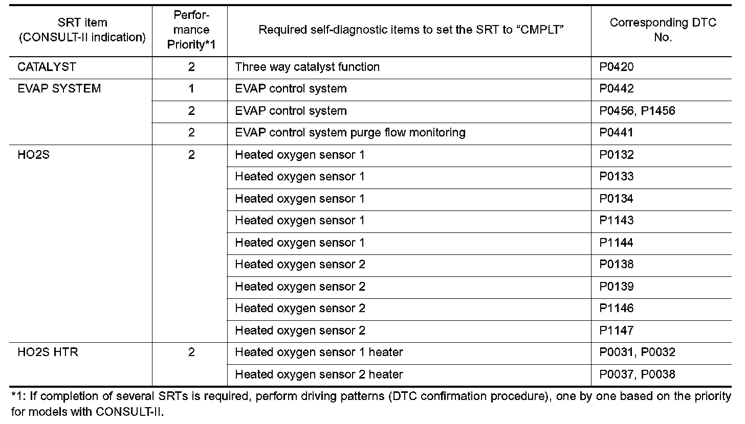 To set all SRT codes, self-diagnosis for the items indicated above must be performed one or more times. Each diagnosis may require a long period of actual driving under various conditions.