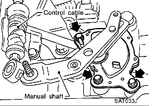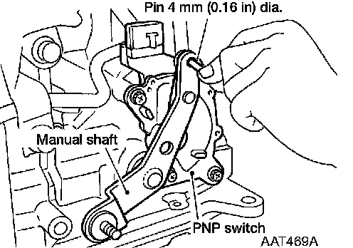 4. Insert pin into adjustment holes in both park/neutral position (PNP) switch and manual shaft as near vertical as possible.