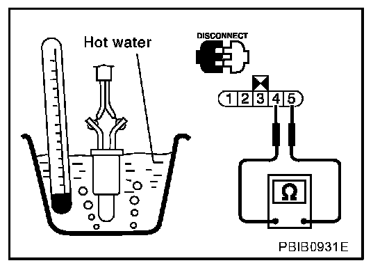 2. Check resistance between fuel level sensor unit and fuel pump terminals 4 and 5 by heating with hot water or heat gun as shown in the figure.