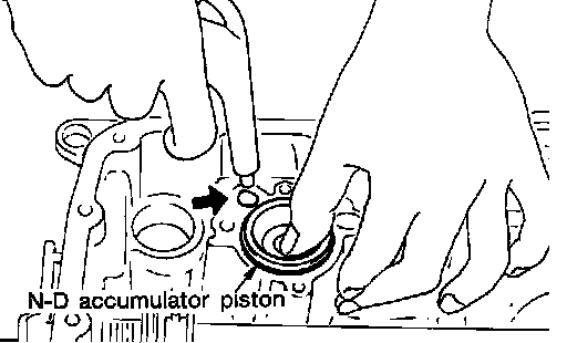 14. Remove N-D accumulator piston and return spring with compressed air.