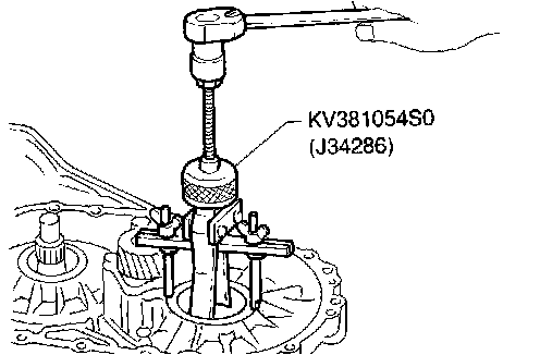 22. Remove differential side bearing outer race and side bearing adjusting shim from transmission case.