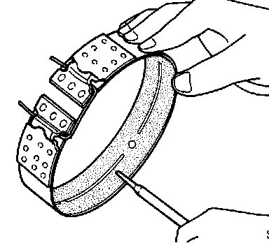- To prevent brake linings from cracking or peeling, do not stretch the flexible band unnecessarily. When removing the brake band, always secure it with a clip as shown. Leave the clip in position after removing the brake band.