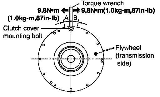1. Install a bolt to clutch cover mounting hole, and place a torque wrench on the extended line of the flywheel center line.