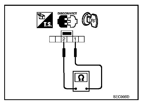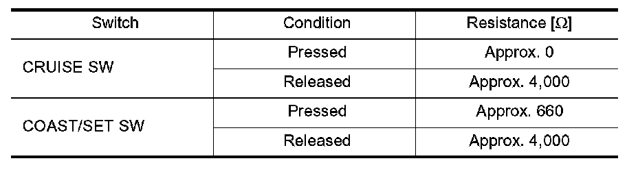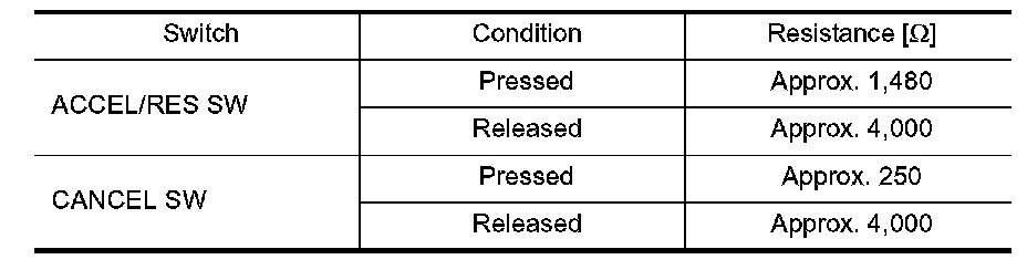Check continuity between ASCD steering switch terminals 1 and 2 with pushing each switch.