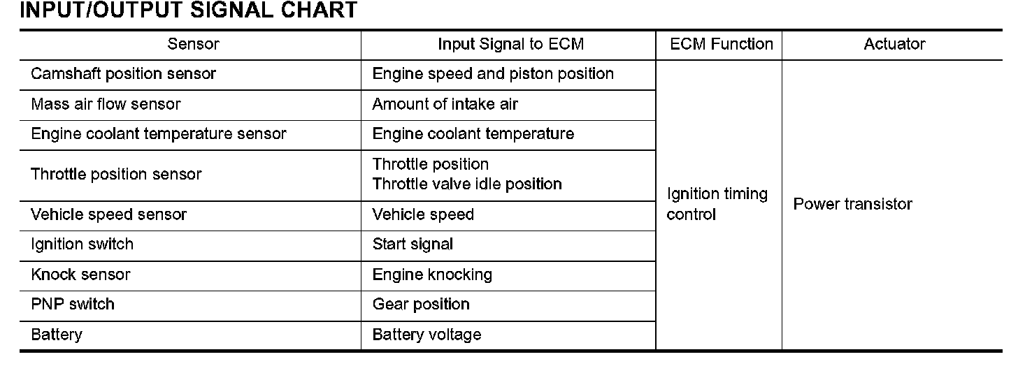 The ignition timing is controlled by the ECM to maintain the best air-fuel ratio for every running condition of the engine. The ignition timing data is stored in the ECM. This data forms the map shown.