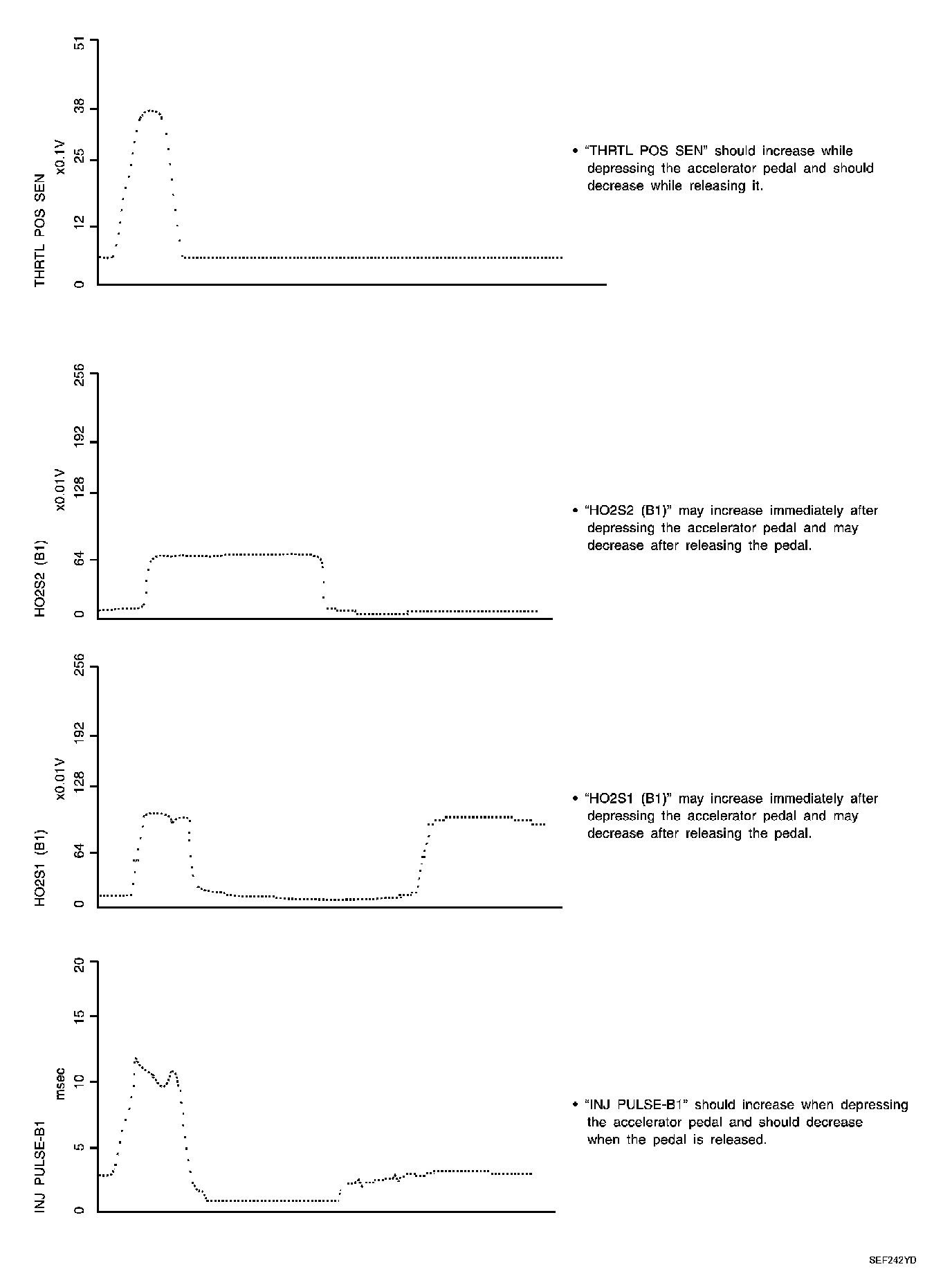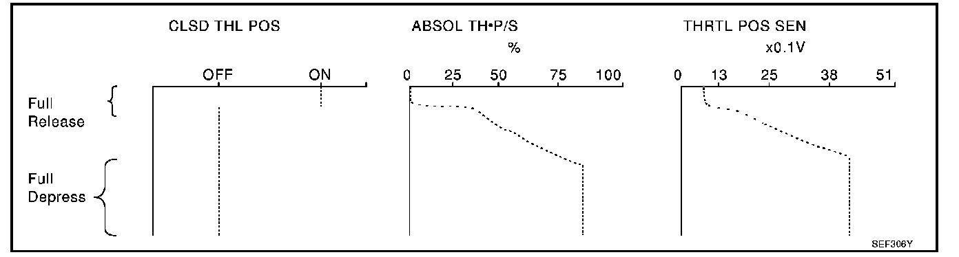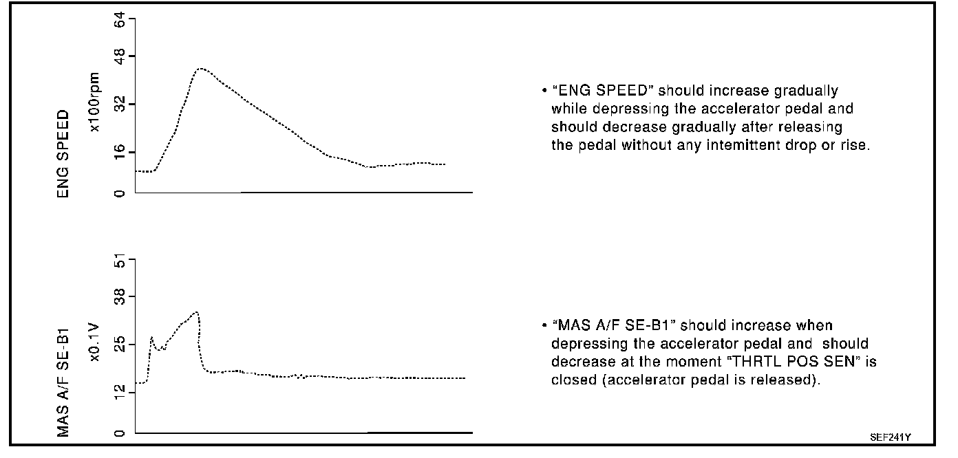 The following are the major sensor reference graphs in "DATA MONITOR" mode. (Select "MANU TRIG" in "DATA MONITOR" with CONSULT-II. "Trigger Point" is set to 100%, "Recording Speed" is set to MAX..)THRTL POS SEN, ABSOL TH.P/S, CLSD THL P05