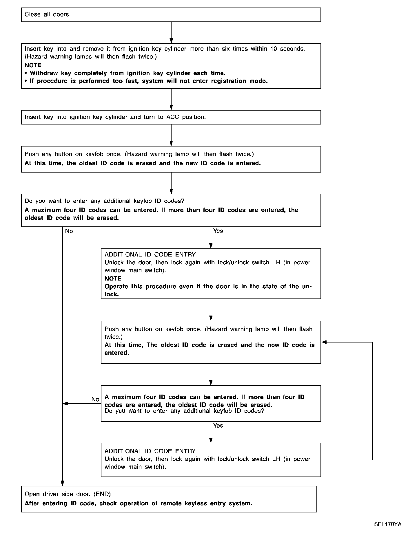 - When registering an additional keyfob, the existing ID codes in memory may or may not be erased. If four ID codes are stored in memory, when an additional code is registered, only the oldest code is erased. If less than four ID codes are stored in memory, when an additional ID code is registered, the new ID code is added and no ID codes are erased.