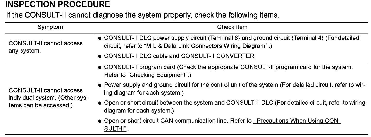 - If CONSULT-II is used with no connection of CONSULT-II CONVERTER, malfunctions might be detected in self-diagnosis depending on control unit which carry out CAN communication.
