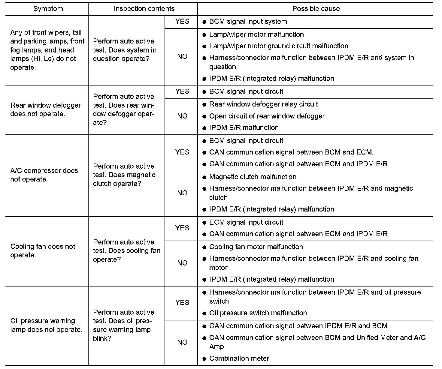 - If any of systems controlled by IPDM E/R cannot be operated, possible cause can be easily diagnosed using auto active test.