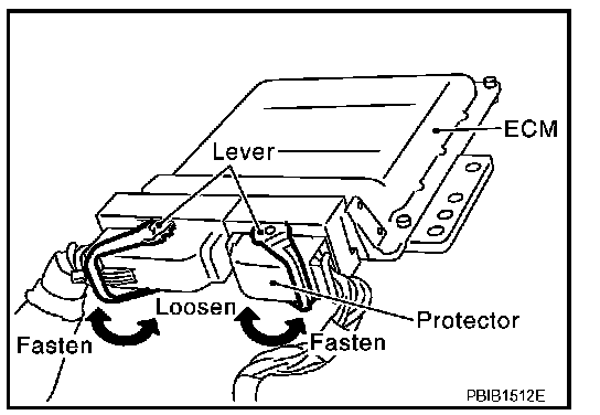 - When connecting ECM harness connector, fasten it securely with levers as far as they will go as shown at right.