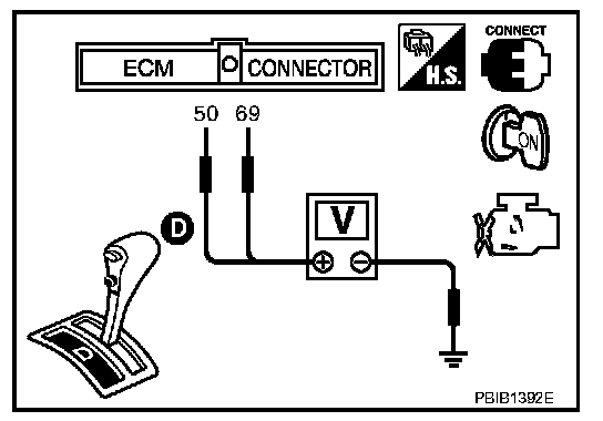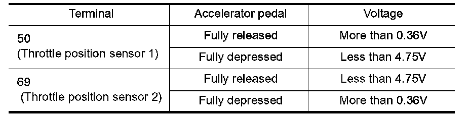 5. Check voltage between ECM terminals 50 (TP sensor 1signal), 69 (TP sensor 2signal) and engine ground under the following conditions.
