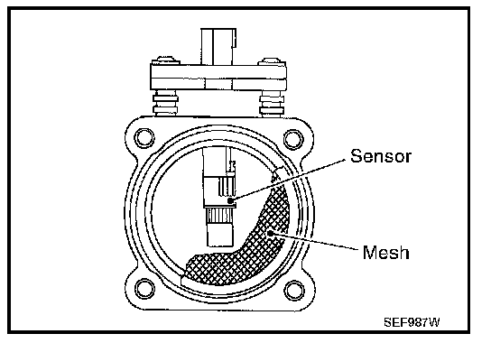 The mass air flow sensor is placed in the stream of intake air. It measures the intake flow rate by measuring a part of the entire intake flow. It consists of a hot film that is supplied with electric current from the ECM. The temperature of the hot film is controlled by the ECM a certain amount. The heat generated by the hot film is reduced as the intake air flows around it. The more air, the greater the heat loss.