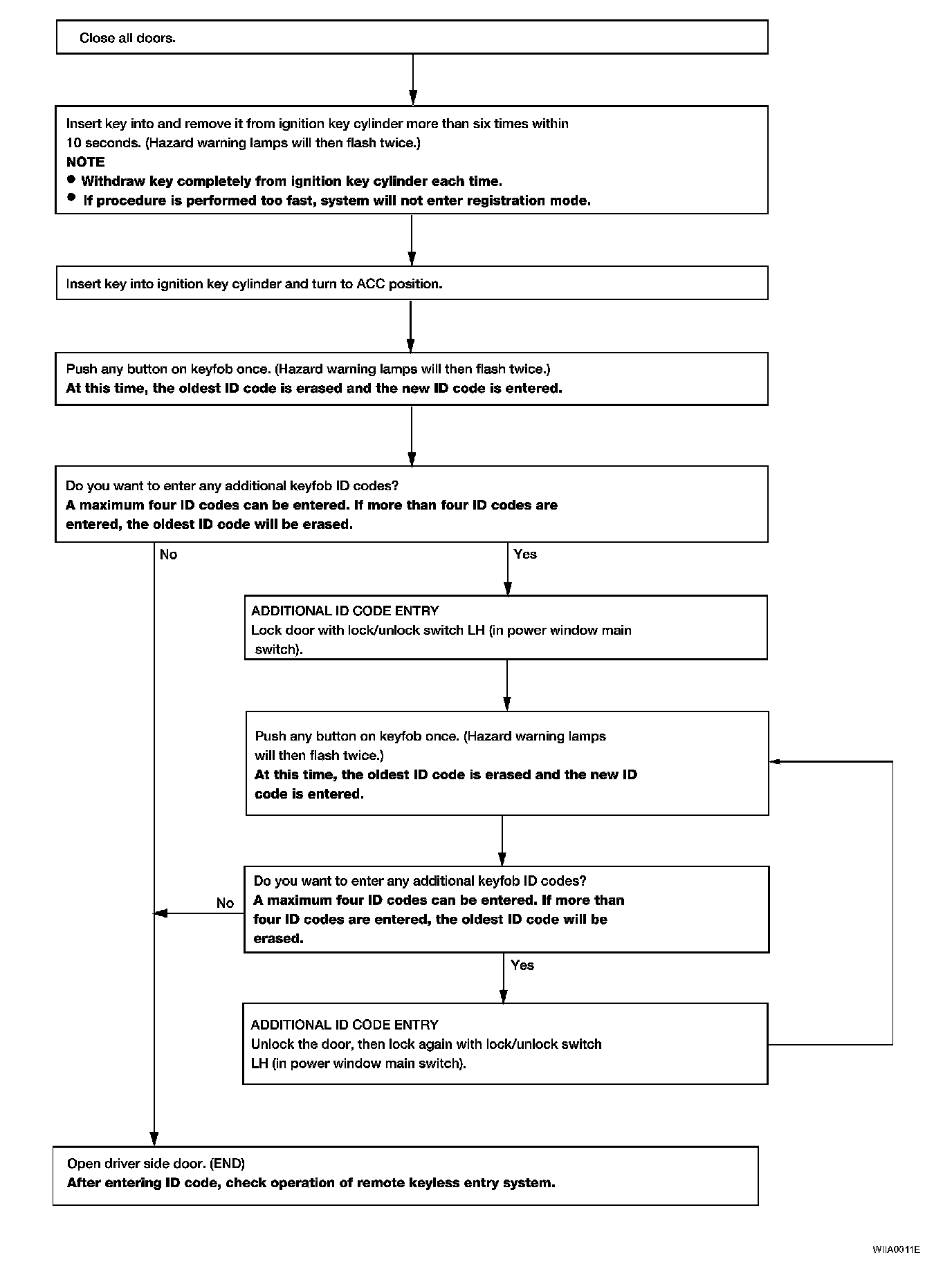 - When registering an additional keyfob, the existing ID codes in memory may or may not be erased. If four ID codes are stored in memory, when an additional code is registered, only the oldest code is erased. If less than four ID codes are stored in memory, when an additional ID code is registered, the new ID code is added and no ID codes are erased.
