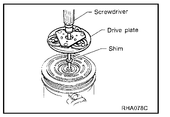 While tightening the center bolt, insert a round bar (screwdriver, etc.) between two of the pins (as shown in the figure) to prevent drive plate rotation. After removing the drive plate, remove the shims from either the drive shaft or the drive plate.