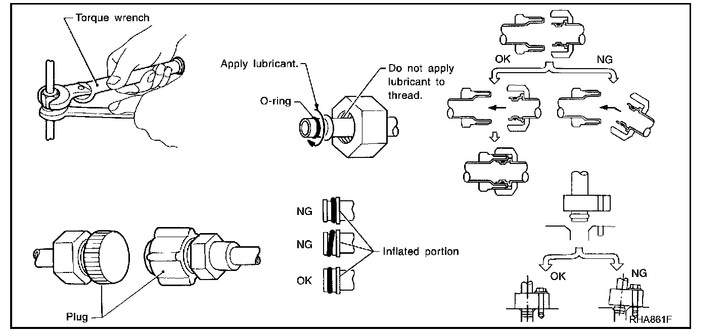 * After connecting line, conduct leak test and make sure that there is no leakage from connections. When the gas leaking point is found, disconnect that line and replace the O-ring. Then tighten connections of seal seat to the specified torque.