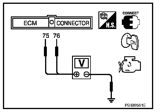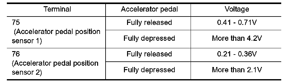 3. Check voltage between ECM terminals 75 (APP sensor 1 signal), 76 (APP sensor 2 signal) and engine ground under the given conditions.
