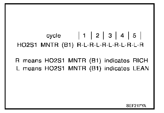 - "HO2S1 MNTR (B1)" in "DATA MONITOR" mode changes from "RICH" to "LEAN" to "RICH" 5 times in 10 seconds. 5 times (cycles) are counted as shown at right.