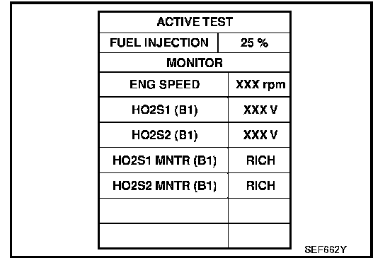 6. Select "FUEL INJECTION" in "ACTIVE TEST" mode, and select "HO2S2 (B1)" as the monitor item with CONSULT-II.