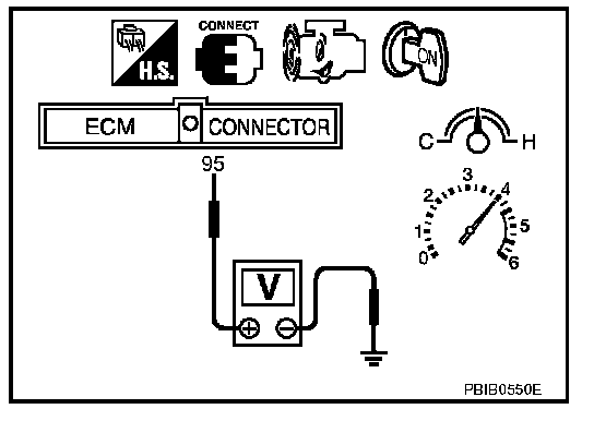 5. Set voltmeter probes between ECM terminal 95 [HO2S2 (B1) signal] and engine ground.