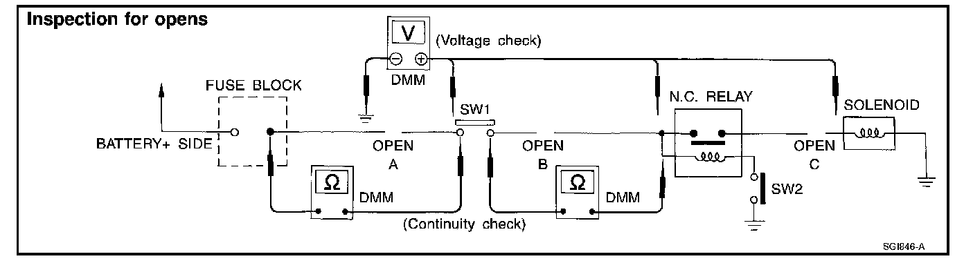 - Connect the other probe to the fuse block (power) side of SW1. Little or no resistance will indicate that portion of the circuit has good continuity. If there were an open in the circuit, the DMM would indicate an over limit or infinite resistance condition. (point A)