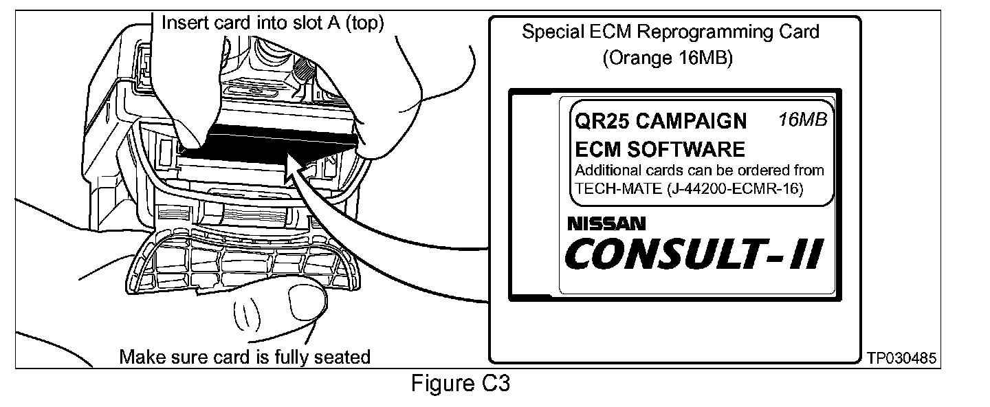 7. Remove the Diagnostics Card (red/white) and install the "QR25 Campaign ECM Software" reprogramming card (Orange 16MB) into slot A of CONSULT-II (see Figure C3).