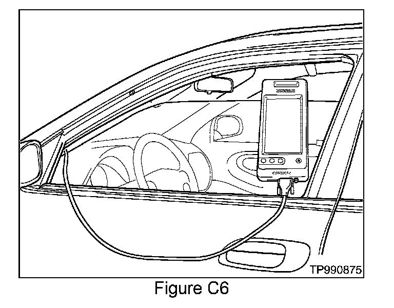 11. Roll the driver's window part way down, exit the vehicle, close the door and hang the CONSULT-II unit on the outside of the window (see Figure C6)