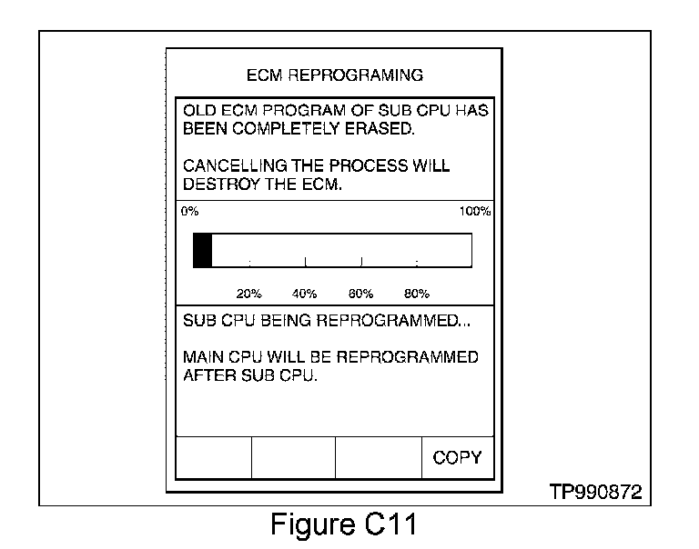 19. Press "START". After a moment the window shown in Figure C11 will come up. CONSULT-II will now turn OFF its screen "backlight" and begin to reprogram the ECM.