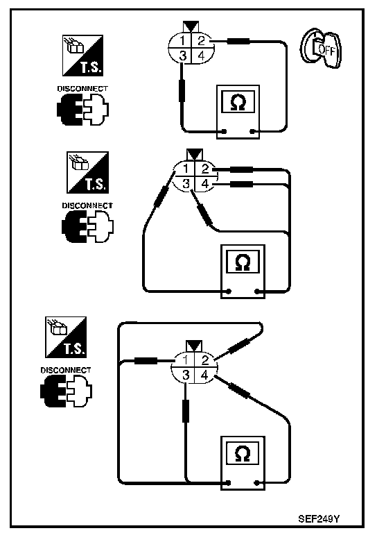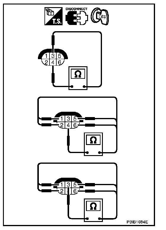 Check continuity between terminals 3 and 1, 2, 5, 6, terminals 4 and 1, 2, 5, 6.