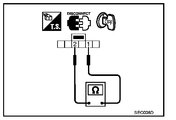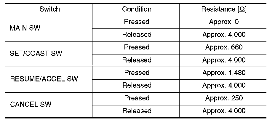 Check continuity between ASCD steering switch terminals 1 and 2 with pushing each switch.