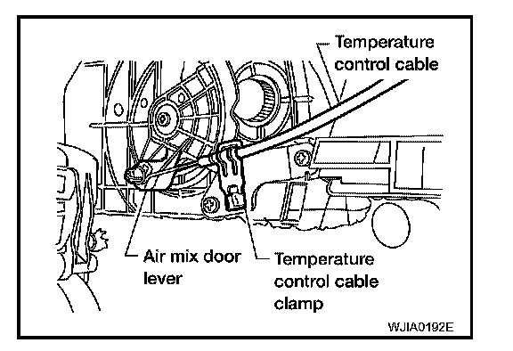 3. Remove the temperature control cable clamp and then remove the cable from the air mix door lever.