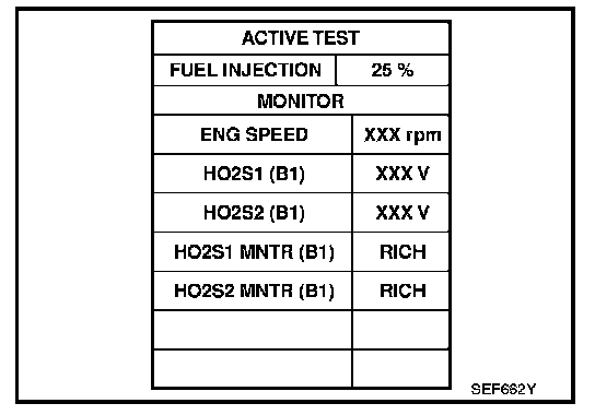 7. Check "HO2S2 (B1)/(B2)" at idle speed when adjusting "FUEL INJECTION" to -25%.