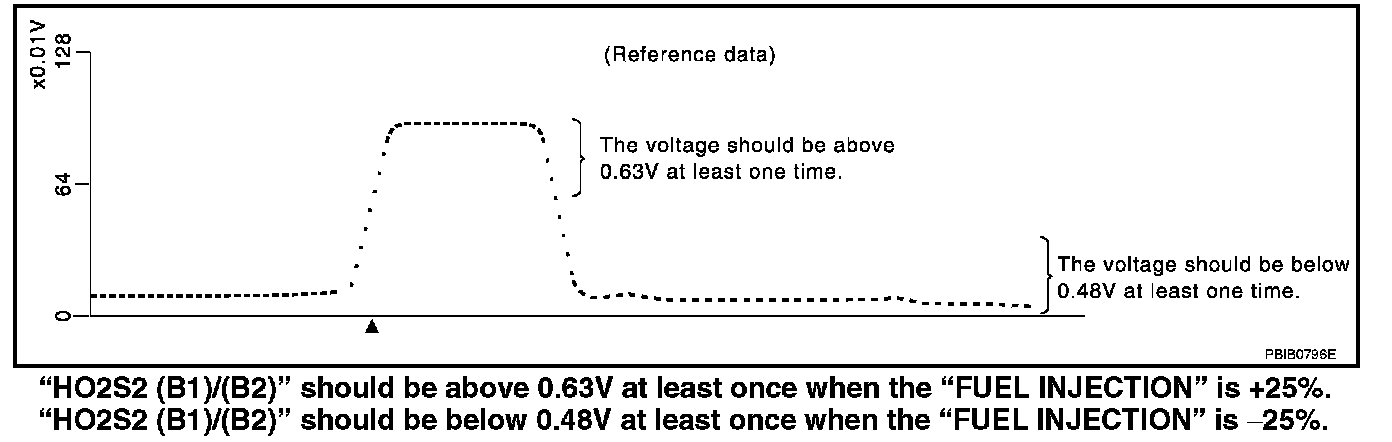 "HO2S2 (B1)/(B2)" should be above 0.63 V at least once when the "FUEL INJECTION" is +25%.